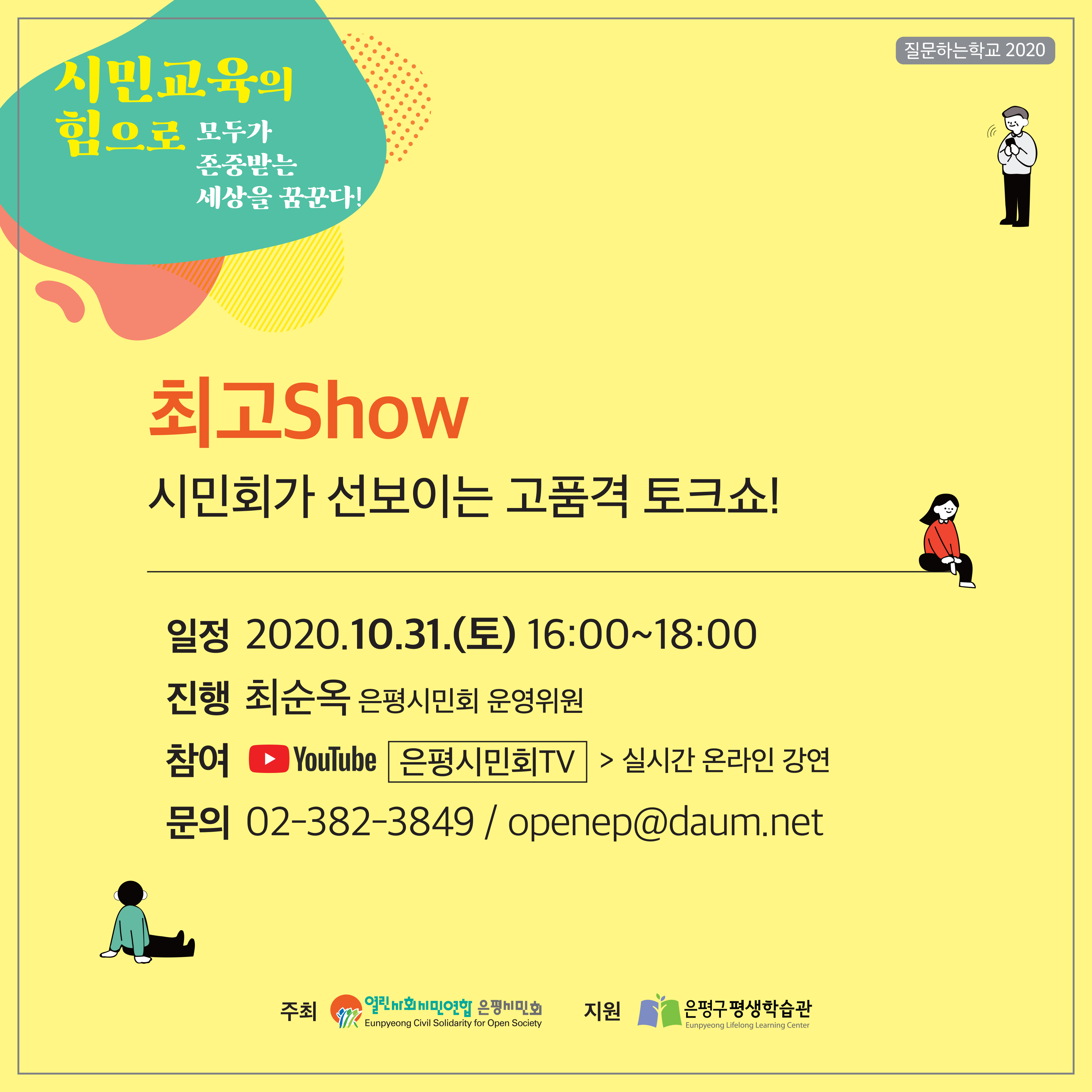 시민회가 선보이는 고품격 토크쇼 [최고Show] 실시간 스트리밍에 많은 관심과 참여 부탁드립니다.