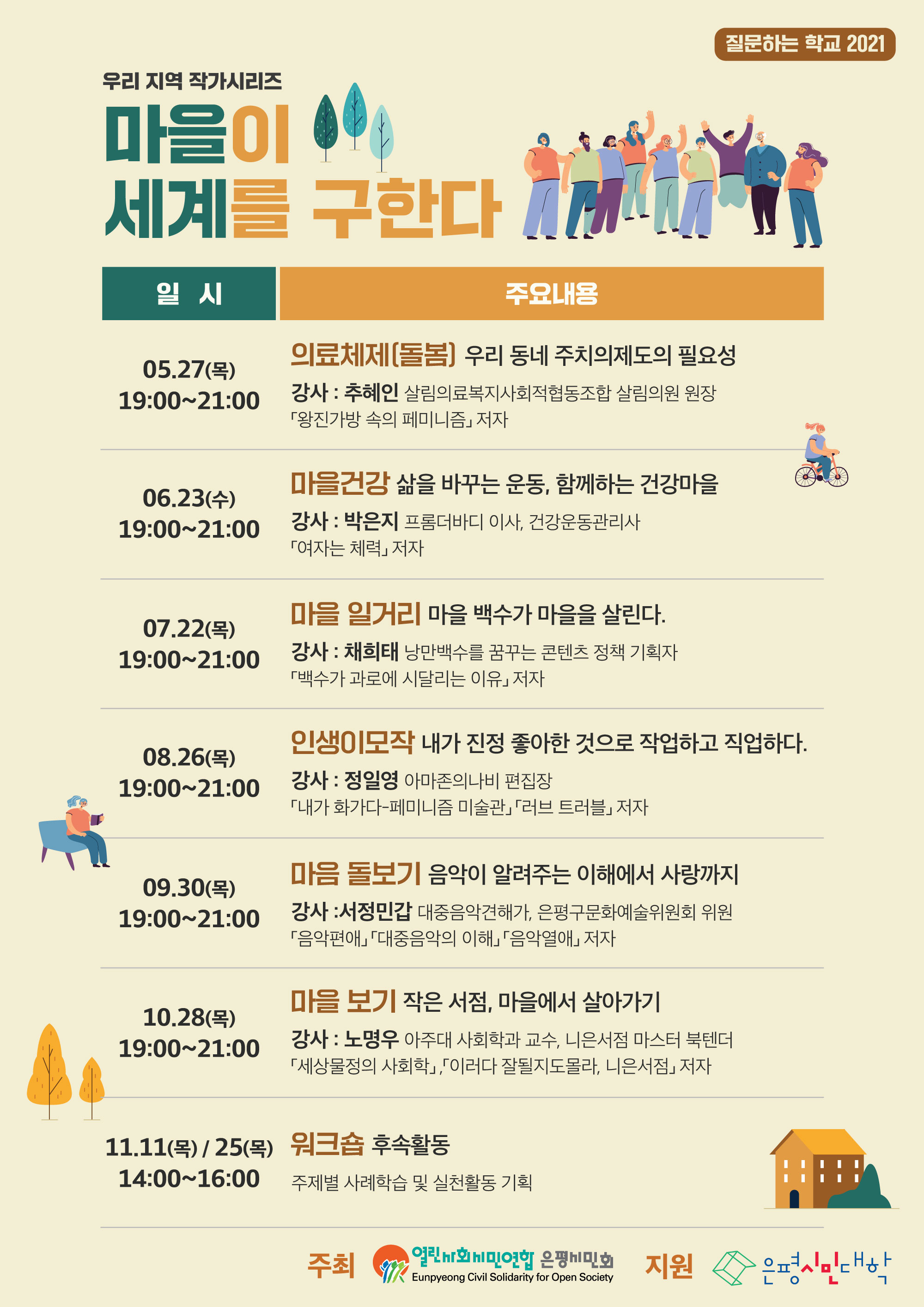 | [질문하는학교] 마을이 세계를 구한다 - 의료체제(돌봄) (0) | 2021.08.19 |