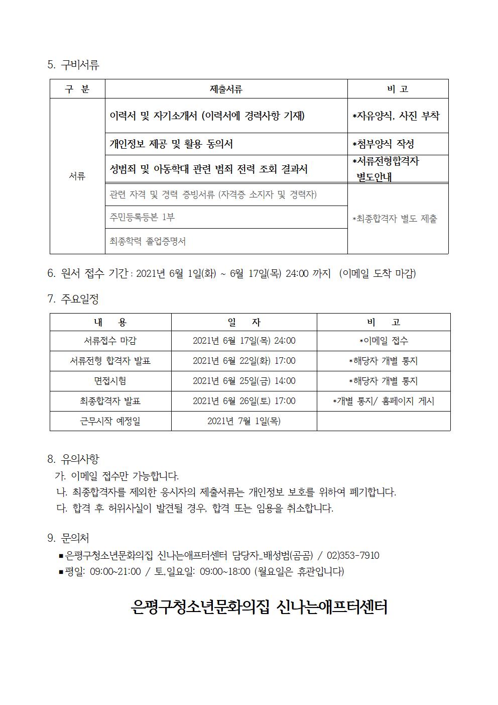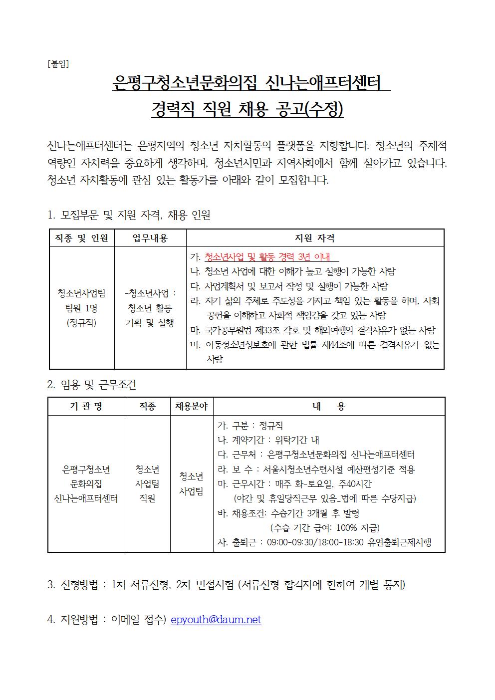 은평구청소년문화의집 신나는애프터센텅에서 경력직 직원을 모집합니다.