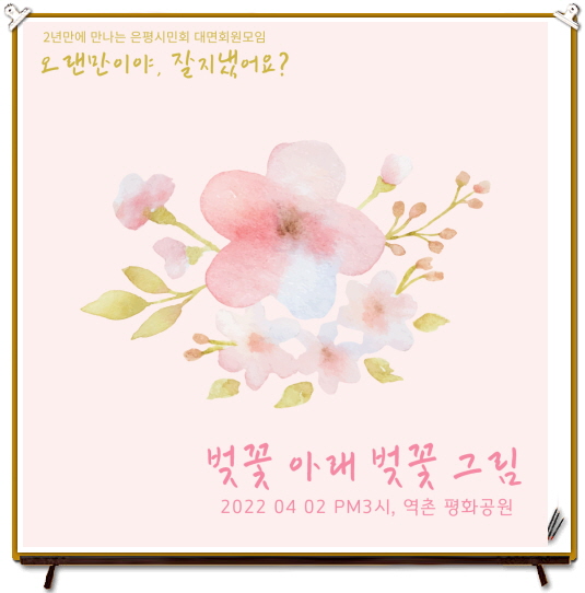 | 4월 회원모임 '벚꽃아래 벚꽃그림' 일정이 변경되었습니다. (0) | 2022.03.30 |
