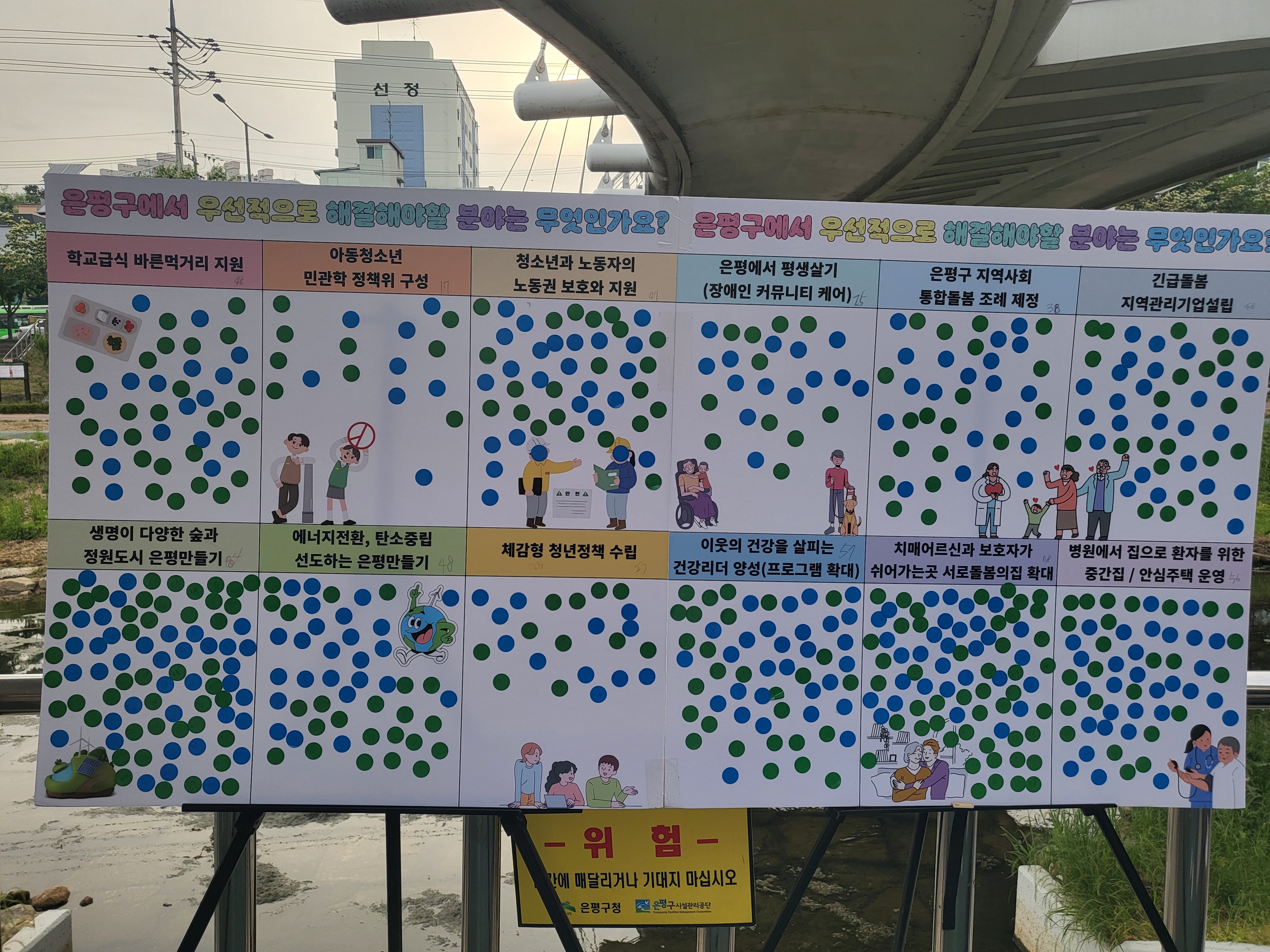 온·오프라인 설문에서 12가지 정책에 대한 정보를 제공했고, 이에 따라 시민들은 자신들의 동의 여부 및 관심사를 표명했다. 오프라인 설문에서 가장 많은 시민들이 우선적으로 해결해야 한다고 의견을 표명한 정책은 “생명이 다양한 숲과 정원도시 은평만들기”였고, 두 번째는 “치매 어르신과 보호자가 쉬어가는 곳, 서로 돌봄의 집 운영“, 그 다음으로 ”은평에서 평생살기 장애인 커뮤니티케어“가 선정되었다. 시민들은 이들 정책을 뽑으면서 은평구내 환경에 대한 부분이 개선되어야 하는 것 뿐만 아니라, 미래세대를 위해 환경 관련 정책이 필요하다고 주장했다. 또 은평구 내 노인 인구가 많다는 점, 오프라인 투표자의 연령대가 40~60대이상이 많았다는 점에서 치매어르신 및 돌봄 정책에 대한 필요도가 높았음을 알 수 있었다.