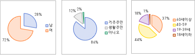 오프라인에서 스티커로 의견을 표시한 시민은 200여 명이지만, 심층 설문에 참여한 시민은 143명이었고, 온라인 설문에 참여한 시민은 106명이었다. 98%가 은평구에 거주 혹은 기반으로 생활하는 시민들이 응답했고, 남녀 성비 및 연령대는 아래 그래프와 같다.