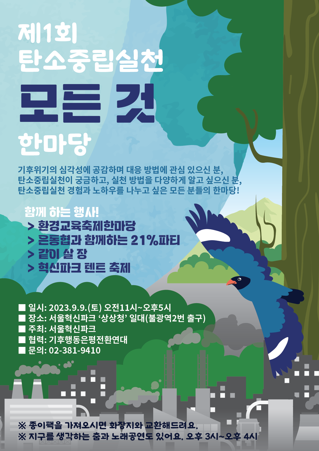 2023년 9월 9일 토요일 오전 11시 ~ 오후5시까지 환경에 관한 모든 것을 체험하고 교육받을 수 있는 행사가 서울혁신파크 상상청에서 진행됩니다.