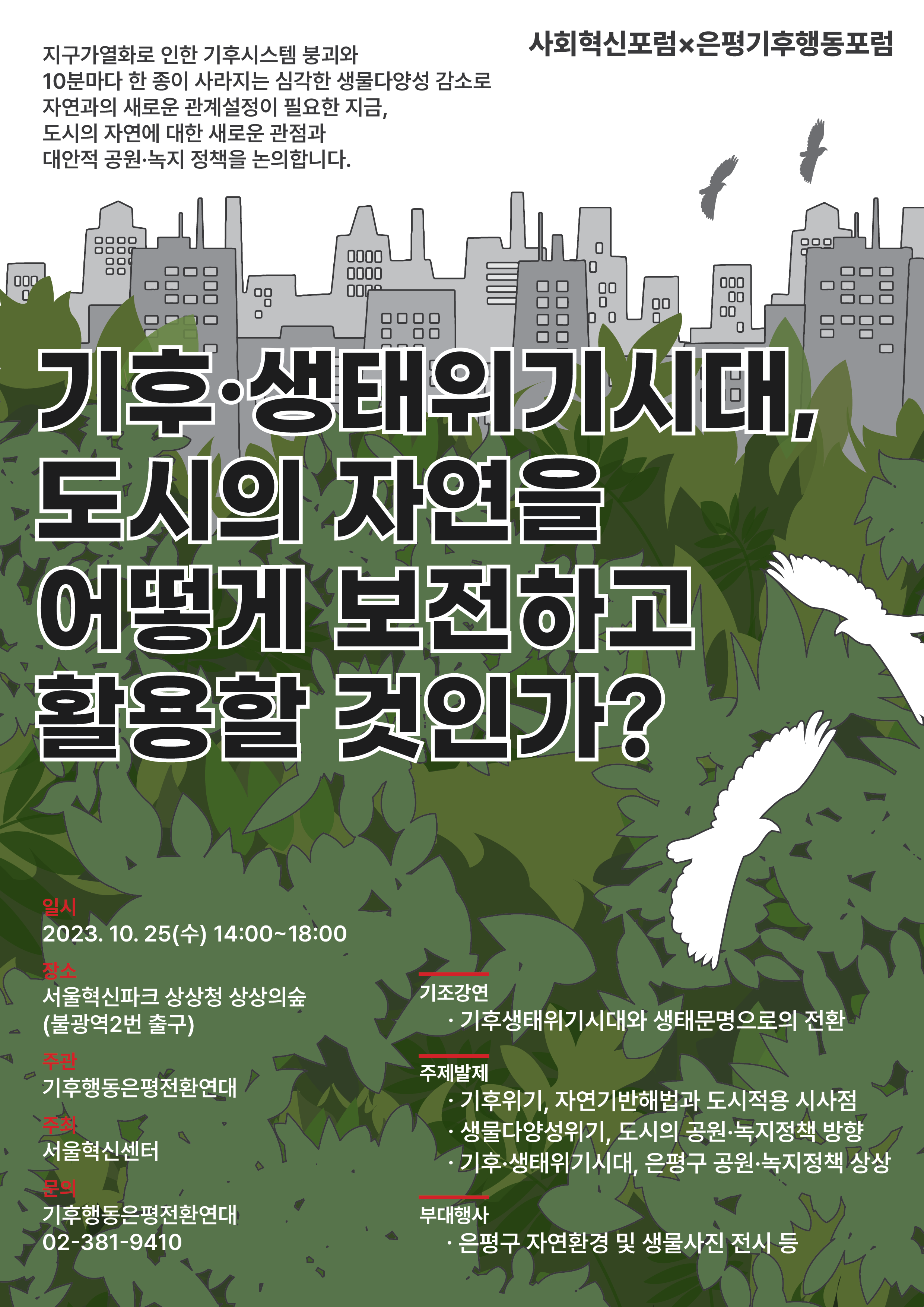 기후행동은평전환연대에서 '기후 생태 위기시대, 도시의 자연을 어떻게 보전하고 활용할 것인가?' 라는 주제로 포럼을 개최한다.