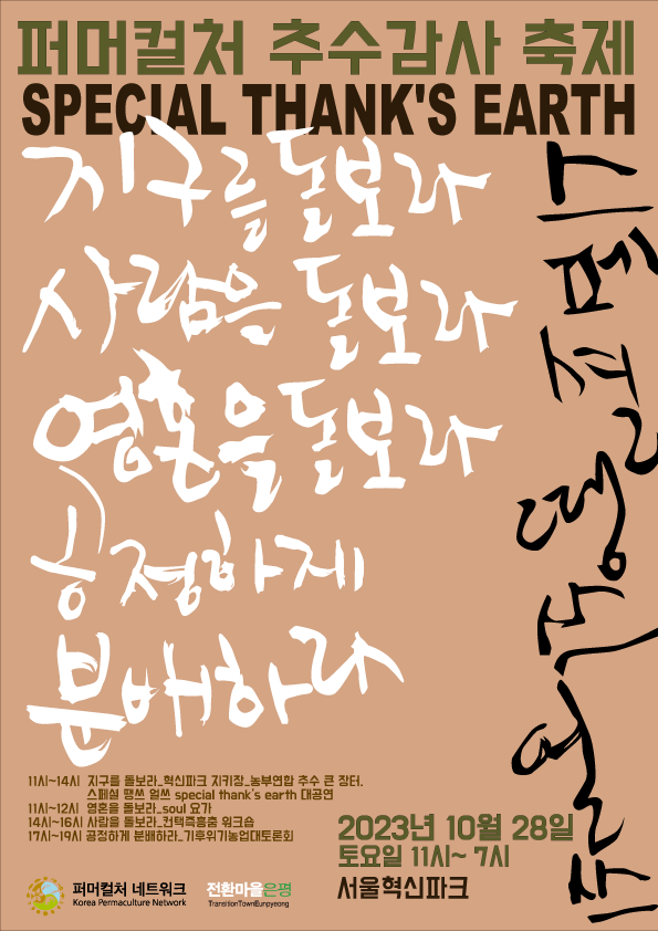 기후위기로 농사 짓기 참 힘들었던 한해였습니다. 그 위기 앞에 물러서지 않고 올한해 농사를 지어낸 농부님들을 응원합니다. 올한해 농부들이 땀과 정성으로 수확한 온전한 먹거리들을 소개하고 하늘과 땅에 감사를 전합니다. 감사의 자리 춤과 노래가 울려 퍼지고 자연과 협력하여 만들어 낸 농부님들의 풍요를 함께 나누고자 합니다. 지구의 품에서 수확한 지구다운 먹거리와 지구살이를 위한 몸과 맘, 철학을 함께 나눕니다.