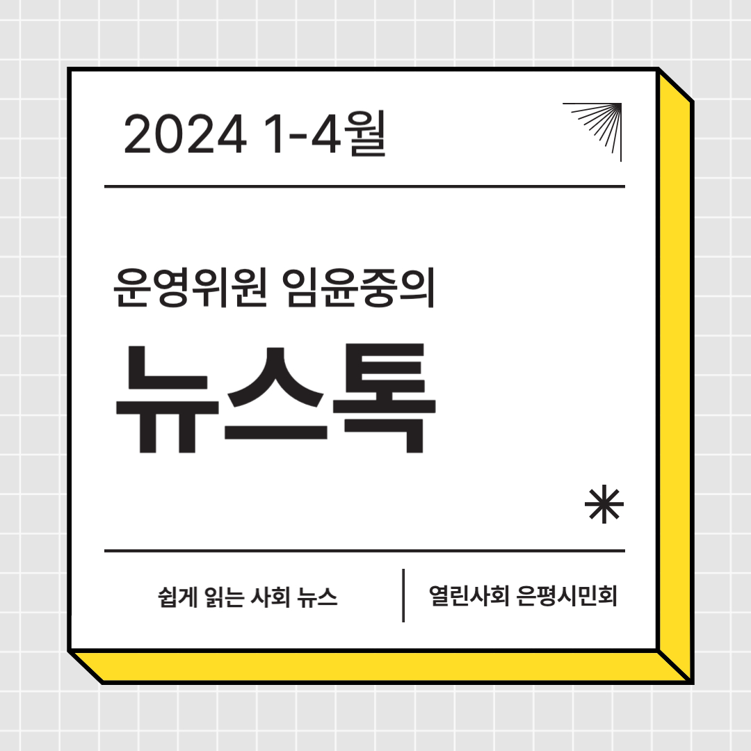 안녕하세요 은평시민회 청년 운영위원 임윤중입니다. 5월부터 매달 15일, 회원 여러분들과 함께 생각하고 싶은 사회 뉴스를 공유합니다. 첫 회차는 1~4월의 주요 뉴스 중 2 가지를 선정하였습니다. 많은 관심 부탁드립니다 :)