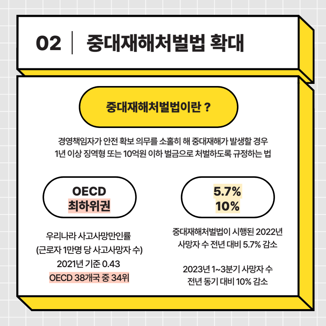 산업재해를 줄이기 위해서는 중대재해처벌법 뿐만 아니라 다방면의 노력이 필요합니다. 중대재해처벌법 확대가 근로자에게 보다 안전한 환경을 제공할 수 있기를 희망합니다.