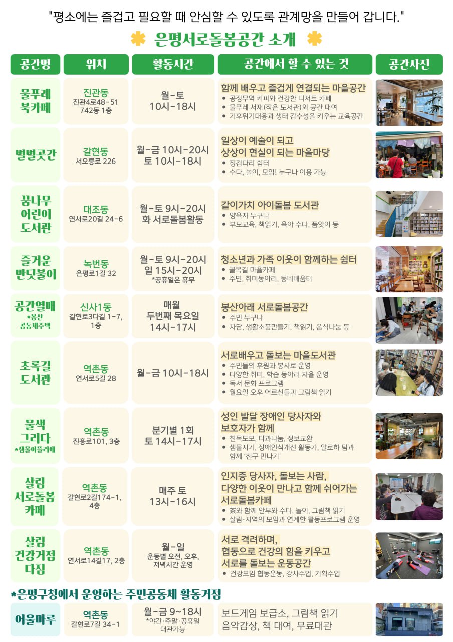 이 공간들이 은평구민들과 함께 즐겁고 소중한 시간들을 공유하고자 합니다.