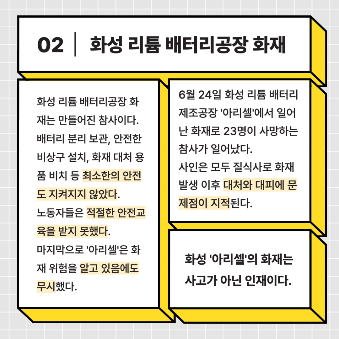 역대 최악의 화학공장 화재 참사로 보이는 화성 아리셀 공장 화재는 우리 사회가 얼마나 안전에 무감각한지 보여준다. 산업 안전부터 일용직 파견직 노동자의 노동권까지 수 많은 문제가 있었음에도 아리셀은 이를 적극 무시하며 참사를 만들었다.