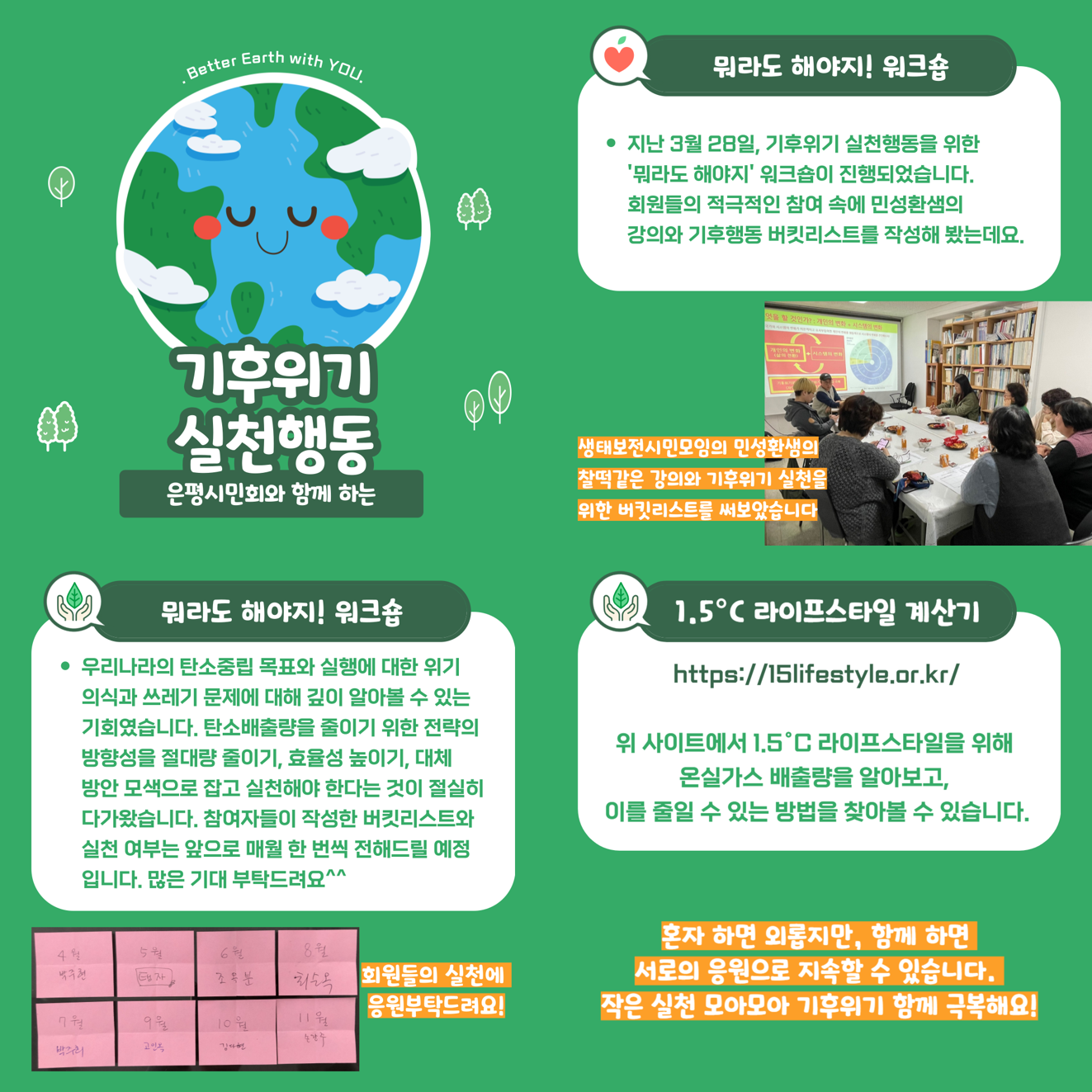 지난 3월 28일, 기후위기 실천행동을 위한 '뭐라도 해야지' 워크숍이 진행되었습니다. 회원들의 적극적인 참여 속에 민성환샘의 강의와 기후행동 버킷리스트를 작성해 봤는데요.