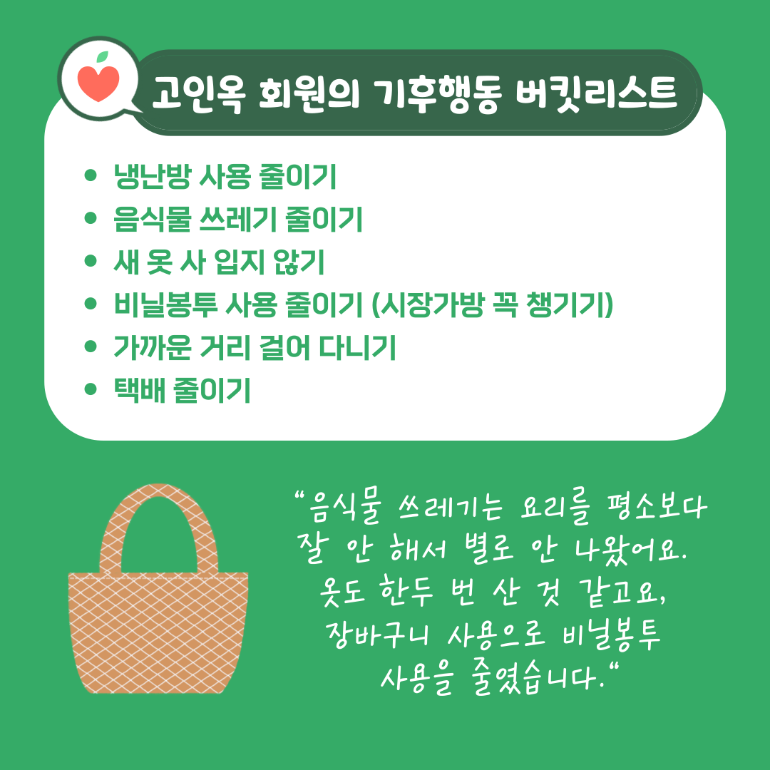 오늘은 고인옥 회원의 기후행동 버킷리스트 실천 현황 전해드립니다.